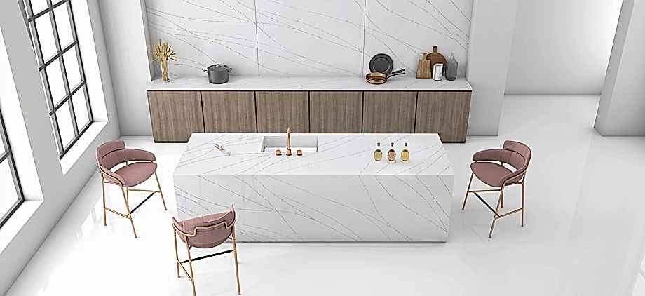 - Doğal kuvarsta bulunan farklı renk tonları, estetik ve dayanıklı yüzeyler bir arada sunulur.